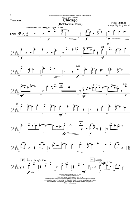 Digital Sheet Music for Chicago - Trombone 1 by Fred Fisher, Jerry Nowak scored for Concert Band; id:409412