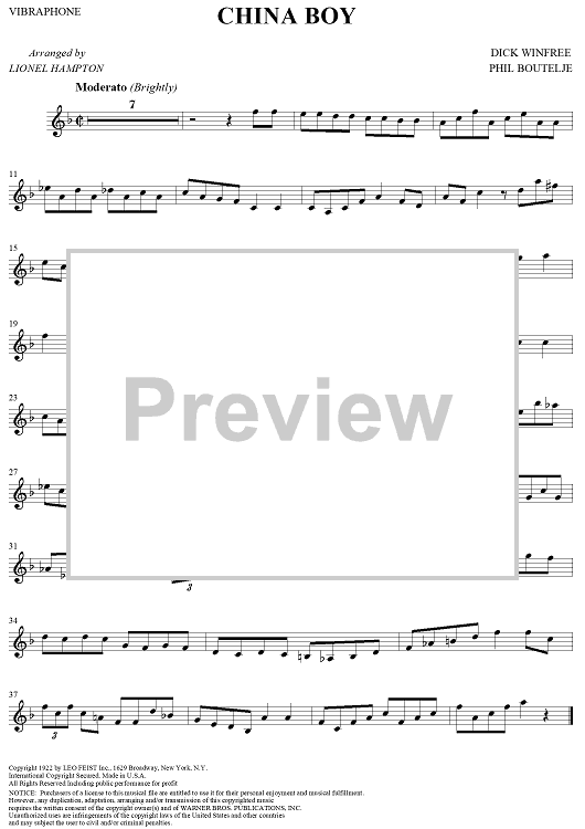 Digital Sheet Music for China Boy - Vibraphone by , Dick Winfree, Phil Boutelje, Lionel Hampton scored for Vibraphone/Piano; id:313722