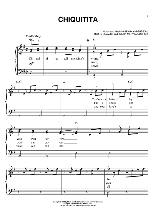 Digital Sheet Music for Chiquitita by ABBA, Benny Andersson, Bjorn Ulvaeus, Buddy Mary Mac-Cluskey scored for Easy Piano; id:388872