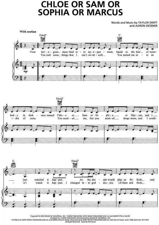"Chloe or Sam or Sophia or Marcus" Sheet Music by Taylor Swift