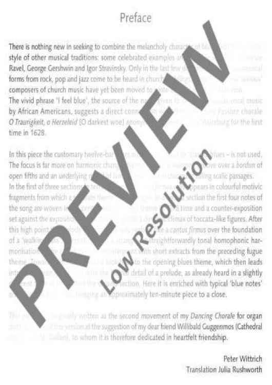 Schon bei Ravel, Gershwin oder Strawinsky findet man die Verbindung des schwermütigen Blues-Charakter mit dem melodischen und klanglichen Duktus der Kunstmusik. Auf der Basis der bildhaften Formulierung „I feel blue“ (Ich fühle mich traurig), die der weltlich-vokalen Ausdrucksform der Farbigen ihren Namen gibt, lässt sich eine direkte Brücke zum populären Passionslied „O Traurigkeit, o Herzeleid“ schlagen. Wittrichs „Choral-Blues“ spielt mit jazz-typischen Harmoniefolgen (changes), triolisch geprägtem Groove mit charakteristischen Bordun-Stützen und einer „Lamento“-Grundstimmung, die sich melodisch in chromatisch fallenden Linien äußert. Das stereotype 12-taktige Blues-Schema bleibt dabei ausgeklammert. Ein wertvoller Beitrag zur Erweiterung des Orgelrepertoires, das sich seit einigen Jahrzehnten auch für populäre Musikformen aus Rock, Pop und Jazz in den Kirchenräumen geöffnet hat.