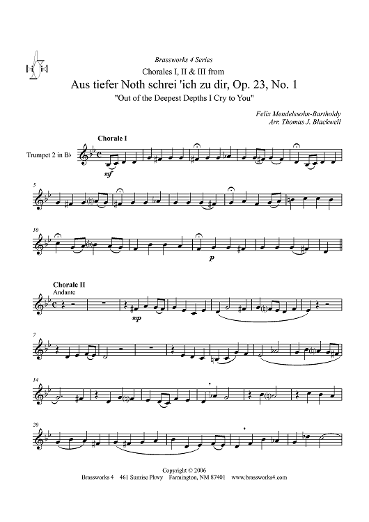 Digital Sheet Music for Chorales I, II & III from Aus tiefer Noth schrei 'ich zu dir, Op. 23, No. 1 - Trumpet 2 in B-flat by Felix Mendelssohn, Thomas J. Blackwell scored for Brass Quartet; id:360994