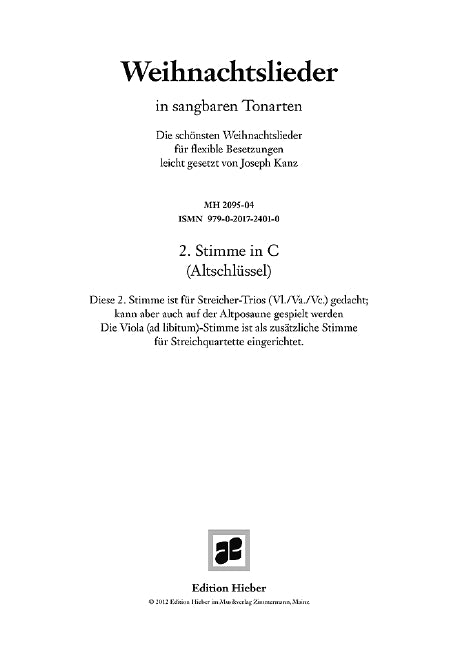 Die schönsten Weihnachtslieder in sangbaren Tonarten leicht gesetzt von Joseph Kanz. Diese 2. Stimme ist für Streicher-Trios (Vl./Va./Vc.) gedacht; kann aber auch auf der Altposaune gespielt werden.
