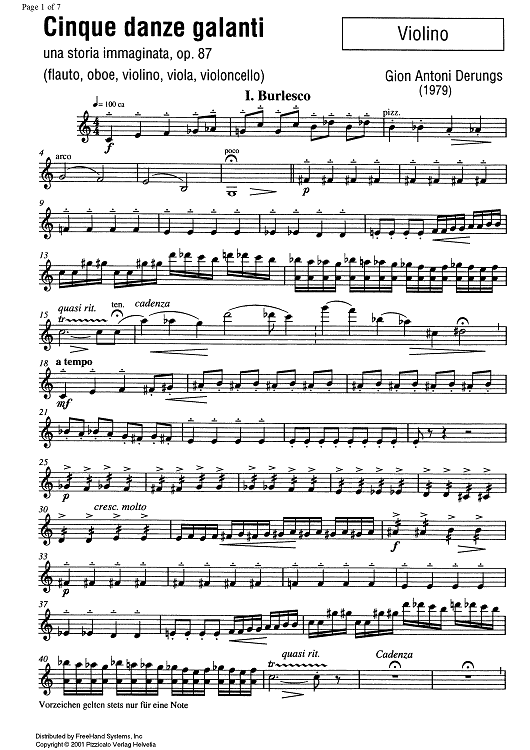 "Cinque danze galanti (Five galant dances) Op.87 - Violin" Sheet Music by Gion Derungs