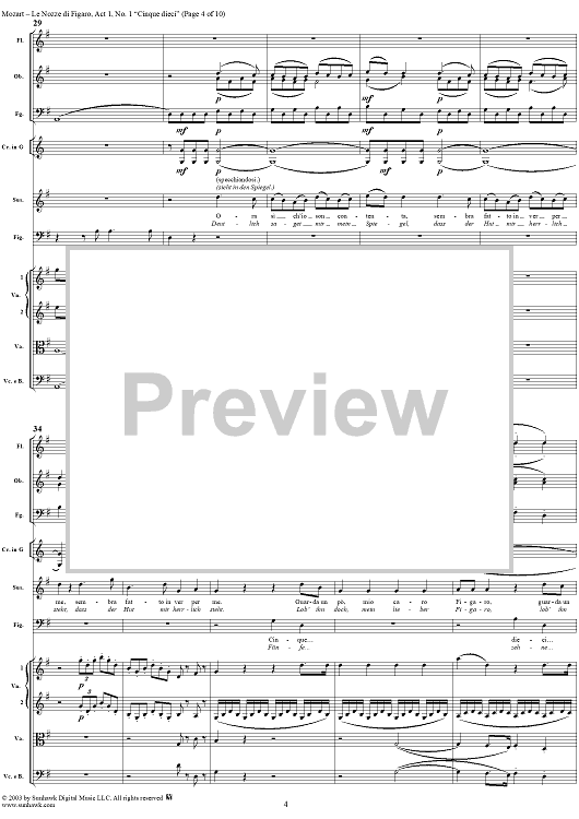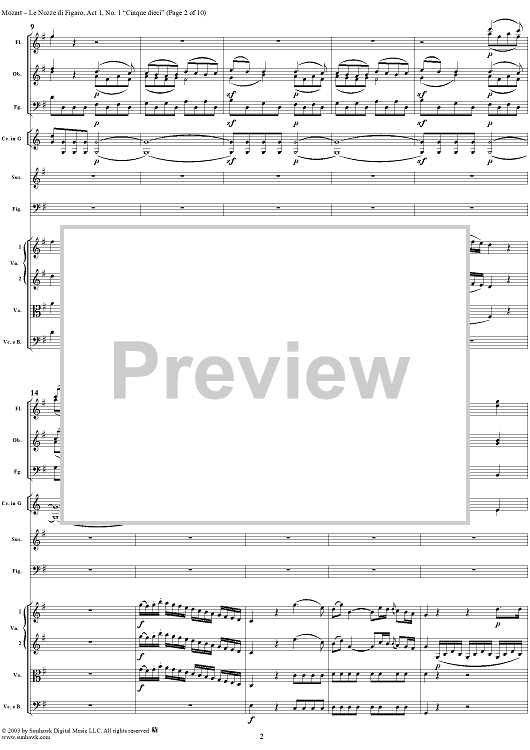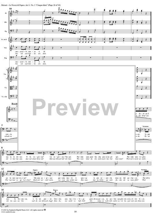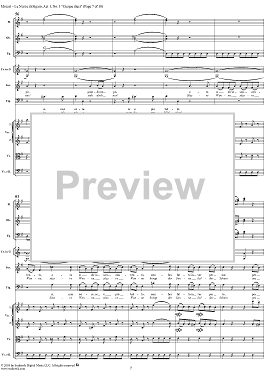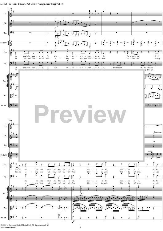 Digital Sheet Music for "Cinque dieci", No. 1 from "Le Nozze di Figaro", Act 1, K492 - Full Score by Wolfgang Amadeus Mozart scored for Voice and Orchestra; id:292181