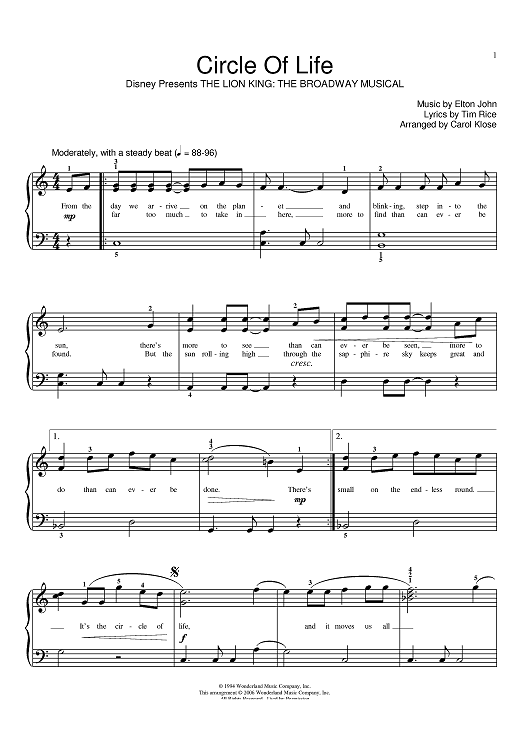 Digital Sheet Music for Circle Of Life by Elton John, Tim Rice, Carol Klose scored for Piano; id:392904