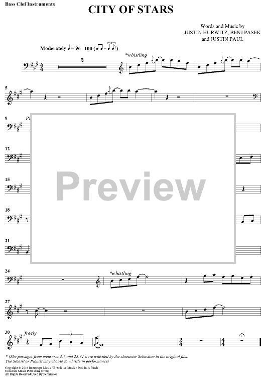 Digital Sheet Music for City of Stars - from La La Land by Justin Hurwitz scored for Bass Clef Instrumental Solo/Piano; id:468983