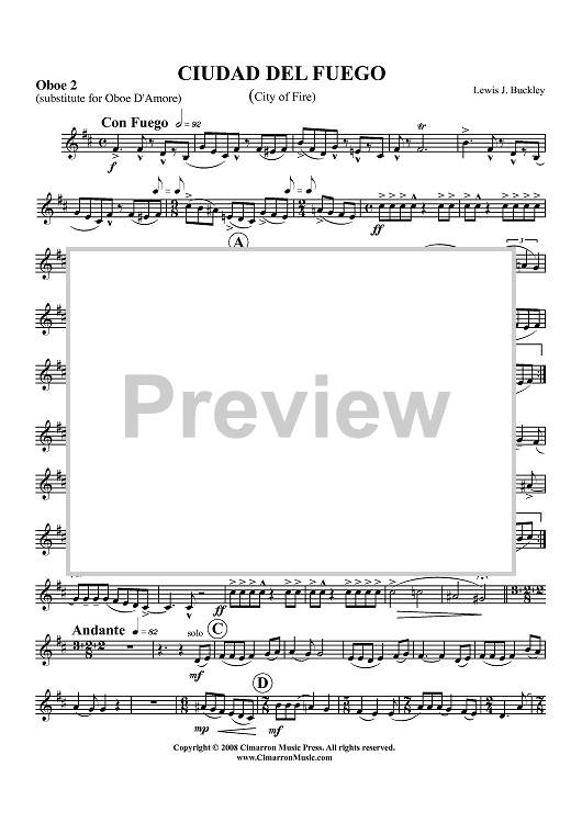 Digital Sheet Music for Ciudad del Fuego (City of Fire) - Oboe d'amore (opt. Oboe 2) by Lewis J. Buckley scored for Double Reed Quartet; id:414029
