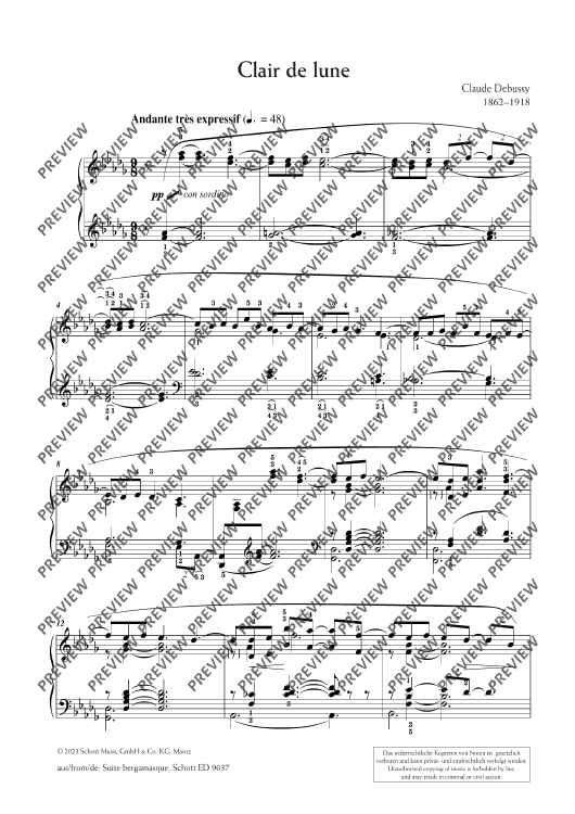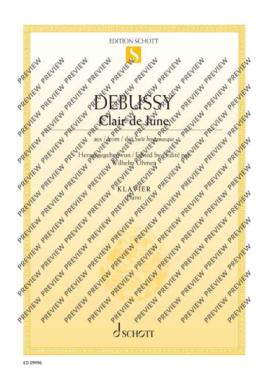 Clair de lune is considered the best-known and most frequently performed composition from Claude Debussy's Suite bergamasque. The third movement of this famous piano suite is full of pictorial inspiration and appears here in an editorially revised single edition.