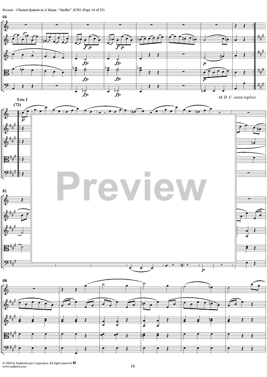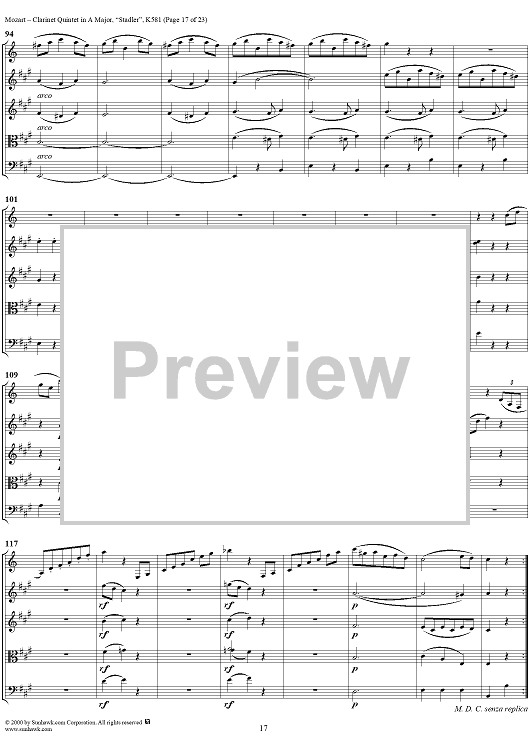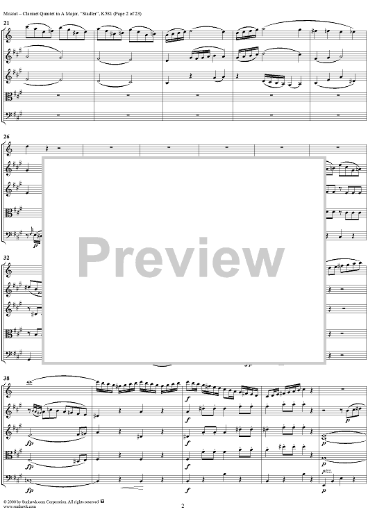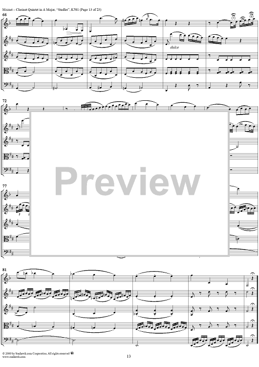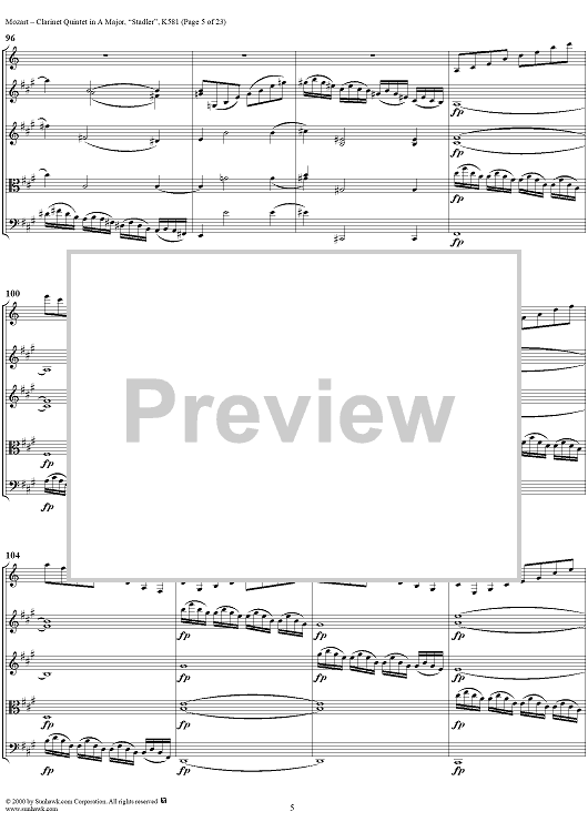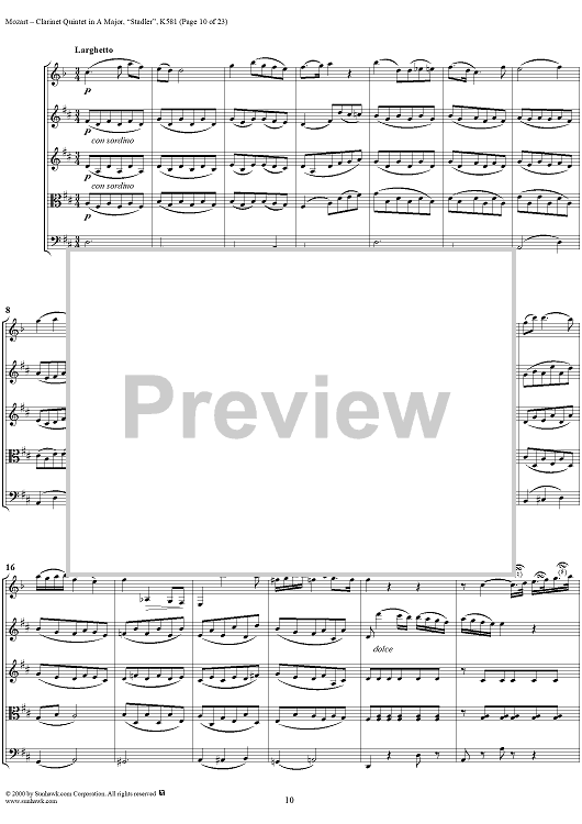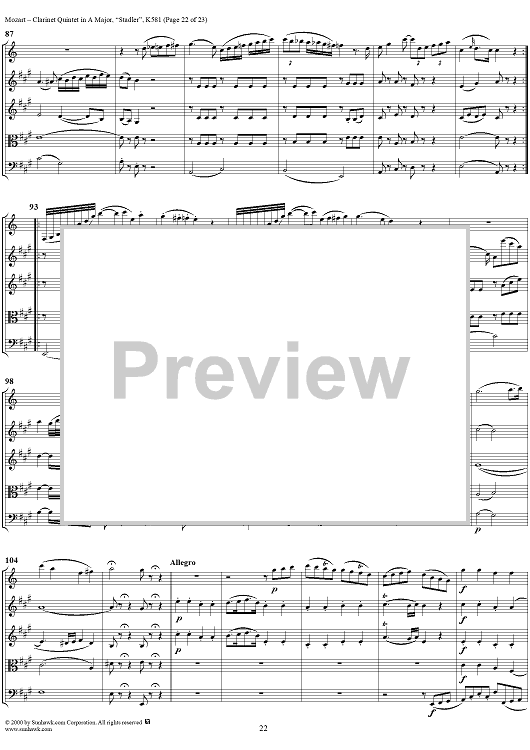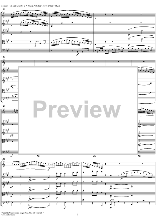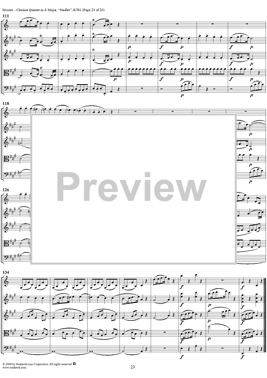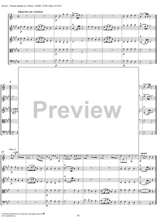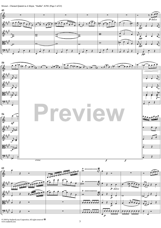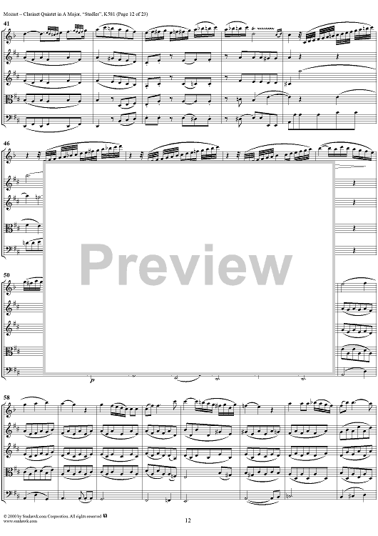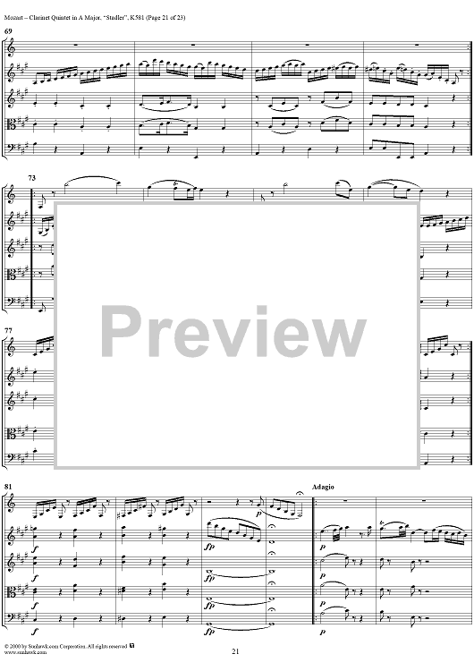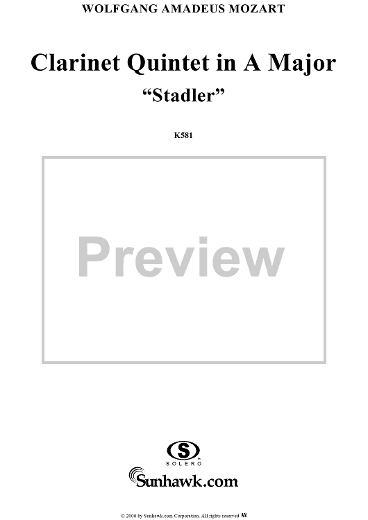 Digital Sheet Music for Clarinet Quintet in A Major, K581 - Full Score by Wolfgang Amadeus Mozart scored for Clarinet/String Quartet; id:235907
