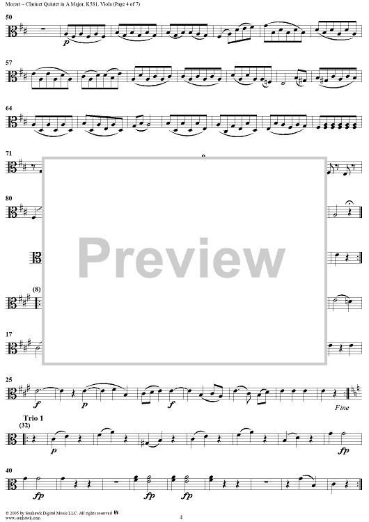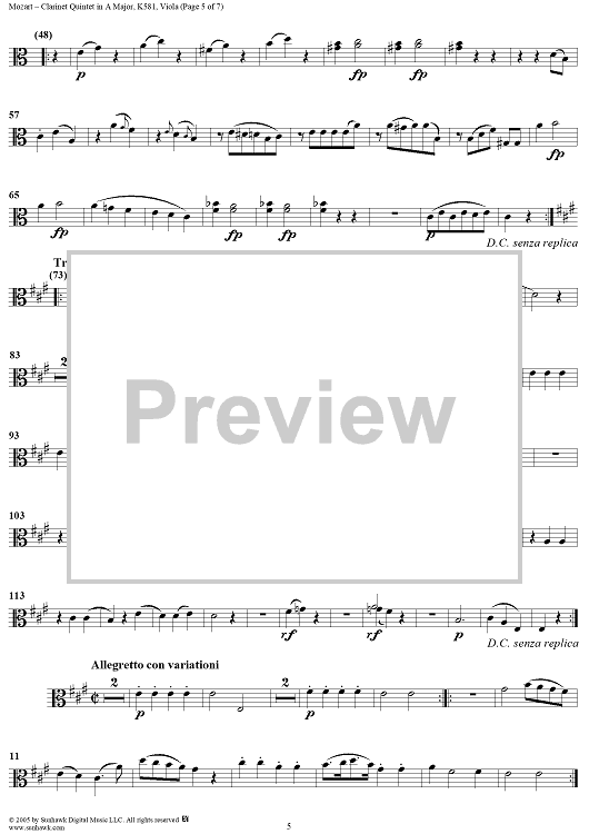 Digital Sheet Music for Clarinet Quintet in A Major, K581 - Viola by Wolfgang Amadeus Mozart scored for Clarinet/String Quartet; id:308192