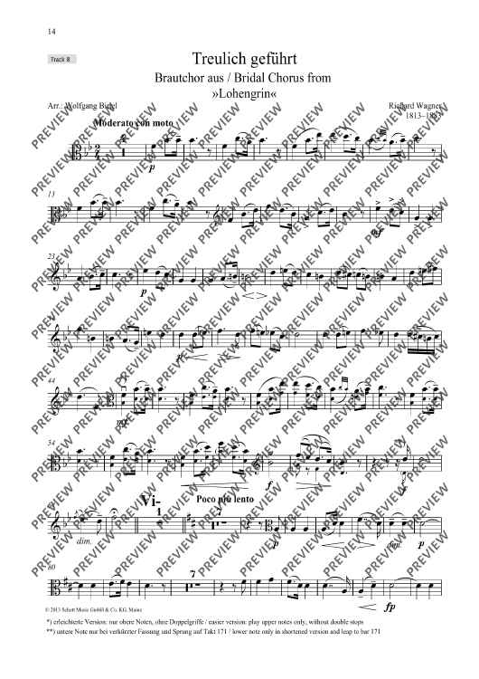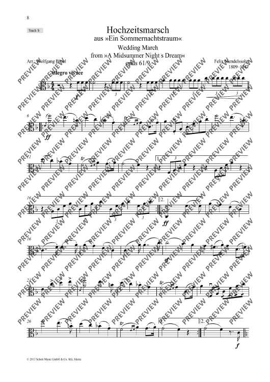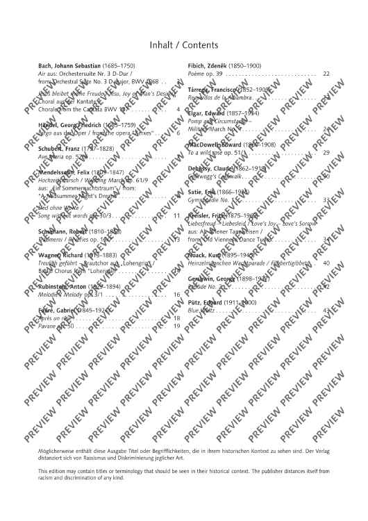 'Classical Highlights' presents the best-known and most popular performance pieces of the classical repertoire in arrangements for viola and piano. Every viola player looking for a popular classic for lessons or recitals will make a find here. Suitable repertoire for musical accompaniment at weddings and funerals can be found here as well. To make practising easier, backing tracks can be downloaded as MP3 files. The piano accompaniment is available in PDF format. Contents: Bach, Air - Handel, Largo - Mendelssohn, Wedding March - Schumann, Träumerei - Schubert, Ave Maria - Elgar, March from 'Pomp and Circumstance' - Ravel, Bolero - Satie, Gymnopédie No. 1 - Kreisler, Liebesfreud - Liebesleid, and others.