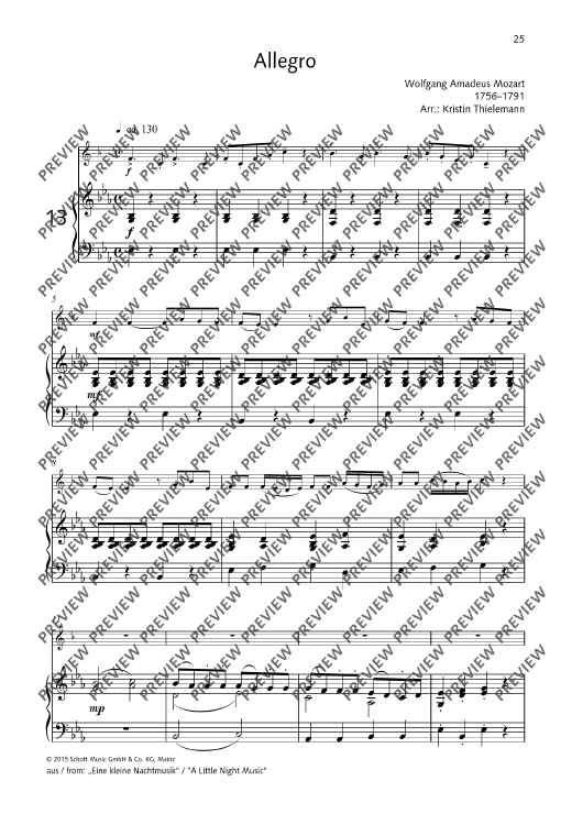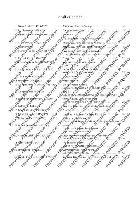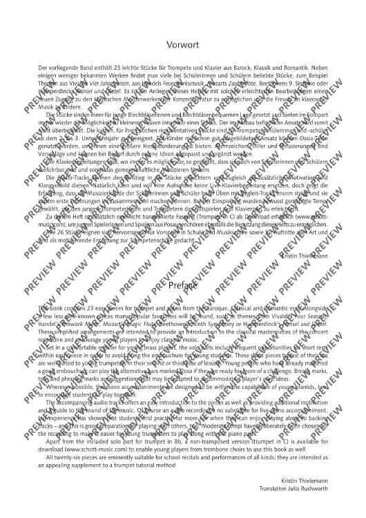 This edition provides young pupils with an access to classical music. Apart from pieces they may already know, like melodies from the Magic Flute, Beethoven's Symphony No. 6 or Vivaldi's Four Seasons, they also get to know other works from the Baroque, Classical and Romantic periods. In order to encourage joint music-making, the piano accompaniment is such that it can also be played by piano pupils.