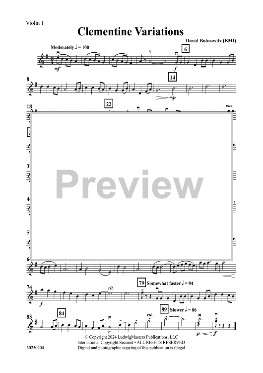 Digital Sheet Music for Clementine Variations - Violin 1 by David Bobrowitz scored for Orchestra; id:503868