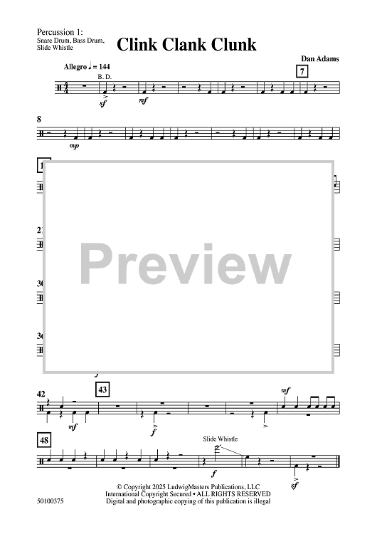 Digital Sheet Music for Clink Clank Clunk - Percussion 1 by Dan Adams scored for Concert Band; id:509466