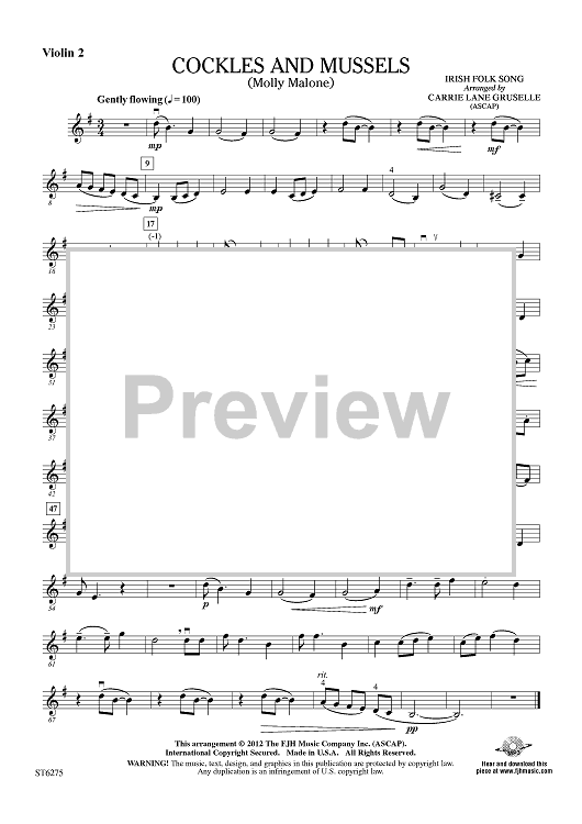Digital Sheet Music for Cockles and Mussels (Molly Malone) - Violin 2 by Carrie Lane Gruselle, Irish Folk Song scored for String Orchestra; id:432012