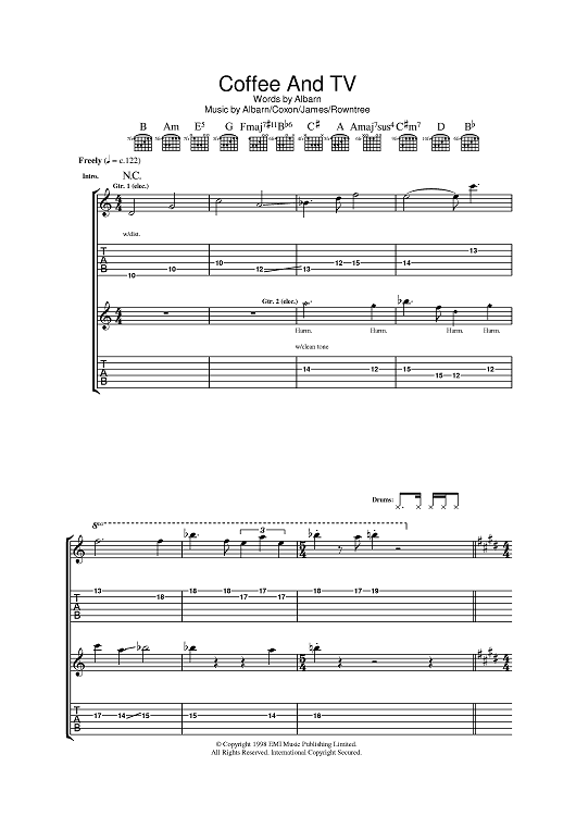 Digital Sheet Music for Coffee & TV by Damon Albarn, Blur, Graham Coxon, Alex James, Dave Rowntree scored for Guitar Tab; id:393183