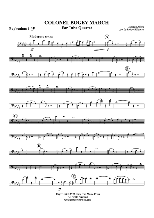 Digital Sheet Music for Colonel Bogey March - Euphonium 1 BC/TC by Kenneth J. Alford, Robert Wilkinson scored for Tuba Quartet; id:316219