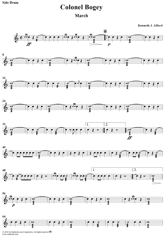 "Colonel Bogey March - Side Drum" Sheet Music by Kenneth J. Alford