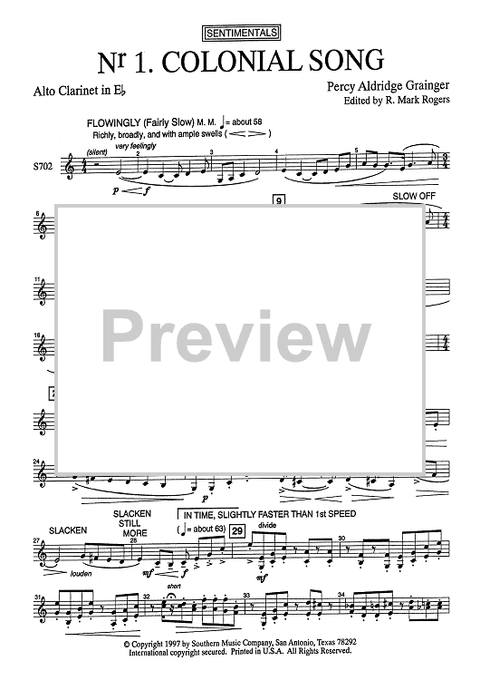 Digital Sheet Music for Colonial Song - Alto Clarinet in Eb by Percy Grainger, R. Mark Rogers scored for Concert Band; id:503555