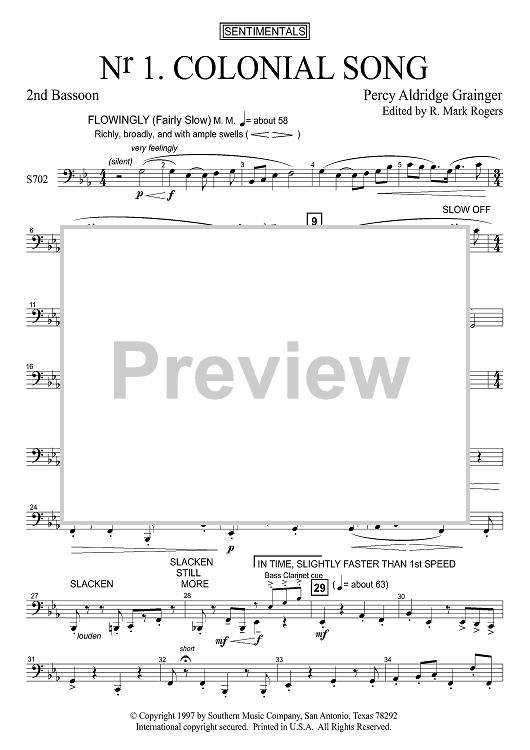 "Colonial Song - Bassoon 2" Sheet Music by Percy Grainger