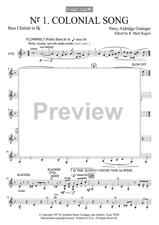 Digital Sheet Music for Colonial Song - Bb Bass Clarinet by Percy Grainger, R. Mark Rogers scored for Concert Band; id:503556