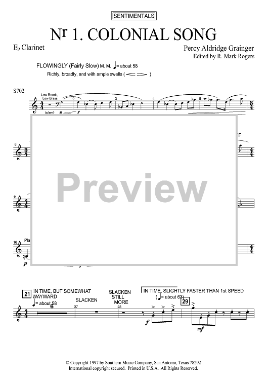 Digital Sheet Music for Colonial Song - Eb Clarinet by Percy Grainger, R. Mark Rogers scored for Concert Band; id:503550