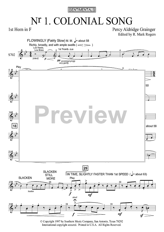 Digital Sheet Music for Colonial Song - F Horn 1 by Percy Grainger, R. Mark Rogers scored for Concert Band; id:503570