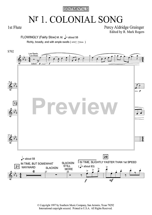 Digital Sheet Music for Colonial Song - Flute 1 by Percy Grainger, R. Mark Rogers scored for Concert Band; id:503545