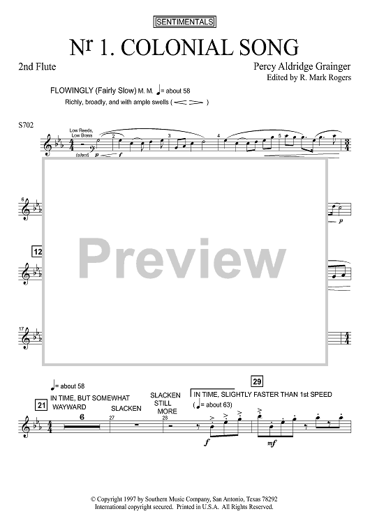 Digital Sheet Music for Colonial Song - Flute 2 by Percy Grainger, R. Mark Rogers scored for Concert Band; id:503546