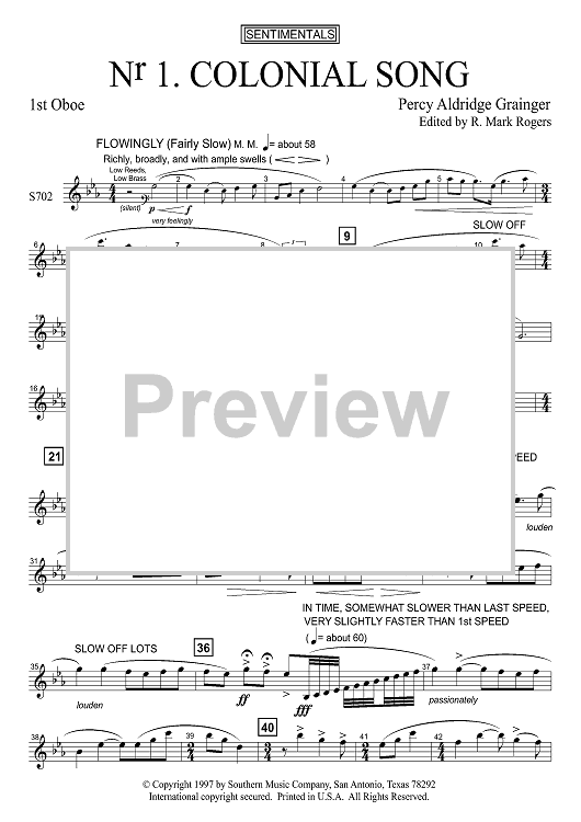 Digital Sheet Music for Colonial Song - Oboe 1 by Percy Grainger, R. Mark Rogers scored for Concert Band; id:503548