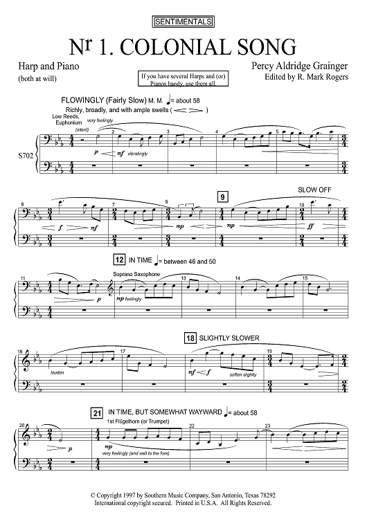 Digital Sheet Music for Colonial Song - Piano and Harp by Percy Grainger, R. Mark Rogers scored for Concert Band; id:503583