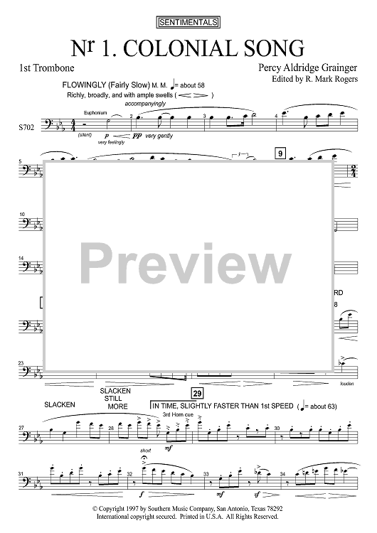 Digital Sheet Music for Colonial Song - Trombone 1 by Percy Grainger, R. Mark Rogers scored for Concert Band; id:503574