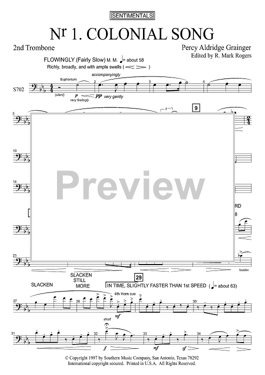 Digital Sheet Music for Colonial Song - Trombone 2 by Percy Grainger, R. Mark Rogers scored for Concert Band; id:503575