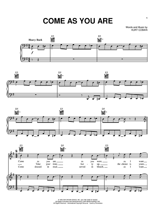 Digital Sheet Music for Come As You Are by Kurt Cobain, Nirvana scored for Piano/Vocal/Chords; id:368462