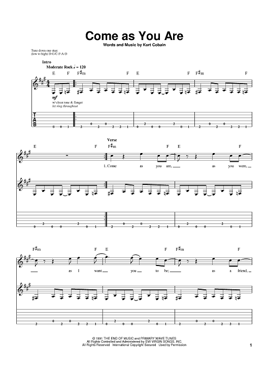Digital Sheet Music for Come As You Are by Kurt Cobain, Nirvana scored for Guitar Tab; id:401556