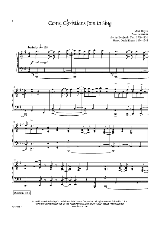 Digital Sheet Music for Come, Christians Join to Sing by Mark Hayes, David Evans, Traditional Spanish, Benjamin Carr scored for Piano Solo; id:433344
