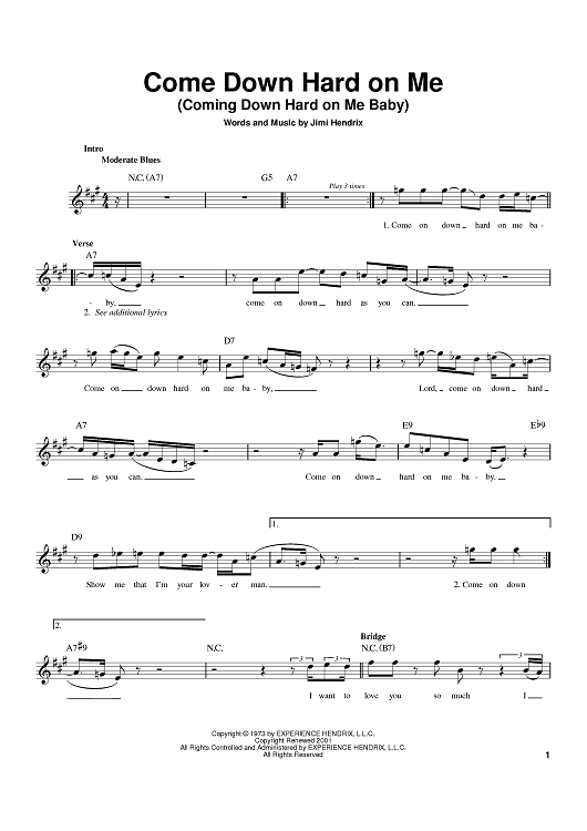 "Come Down Hard On Me (Coming Down Hard On Me Baby)" Sheet Music by Jimi Hendrix