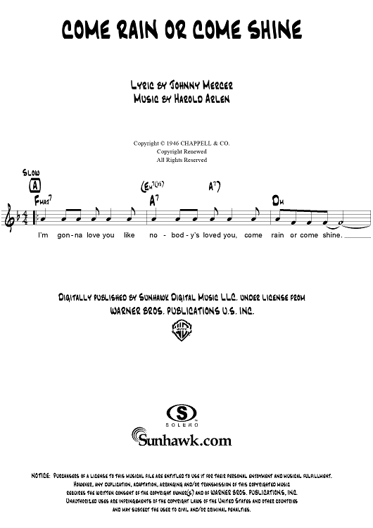 "Come Rain or Come Shine" Sheet Music by Harold Arlen