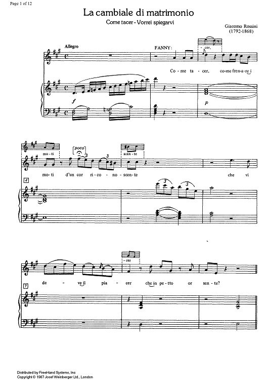 "Come tacer - Vorrei spiegarvi from La cambiale di matrimonio" Sheet Music by Gioachino Rossini