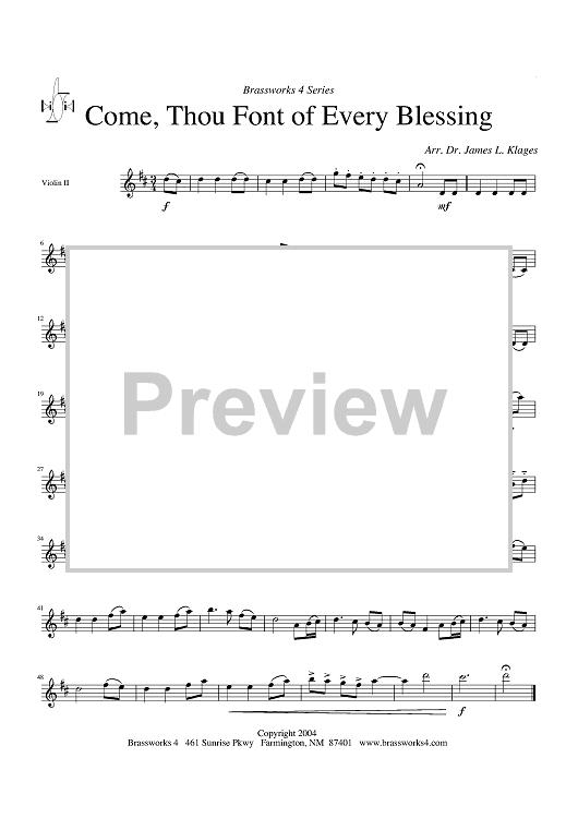 Digital Sheet Music for Come, Thou Font of Every Blessing - Violin 2 by James Klages scored for Cornet/String Quartet; id:318907