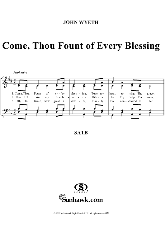 Digital Sheet Music for Come, Thou Fount of Every Blessing by J. Wyeth scored for Four-part Mixed Chorus; id:265214