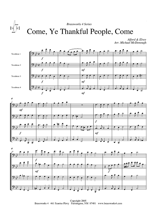 Digital Sheet Music for Come, Ye Thankful People, Come - Score by George J. Elvey, Henry Alford, Michael McDonough scored for Trombone Quartet; id:318703