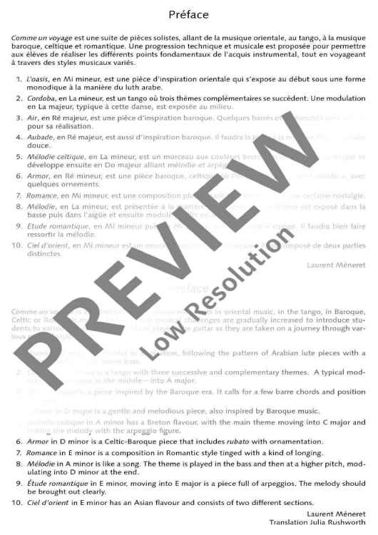 'Comme un voyage' is a series of ten solo pieces inspired by Oriental music, tango as well as by Baroque, Celtic and Romantic music. It is particularly suitable for pupils as it makes increasing technical and musical demands while taking them on a journey through various kinds of musical styles: From 'L’oasis', an Orientally inspired piece with drone bass, via 'Cordoba', a tango with complementary themes, and 'Mélodie celtique', a piece with a Breton touch, to the romantic and longing 'Romance' or 'Etude romantique', a piece of arpeggios. Great complementary material for music teaching.