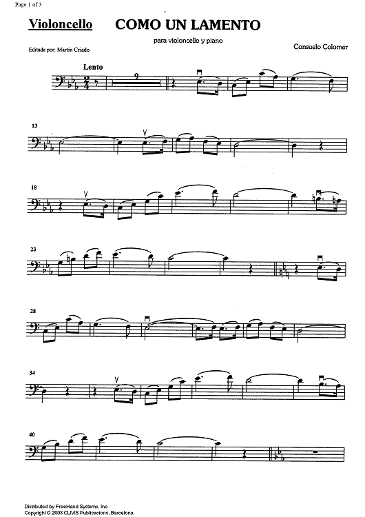 "Como un lamento - Cello" Sheet Music by Consuelo Colomer