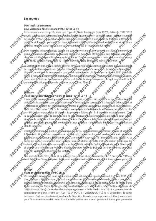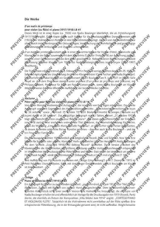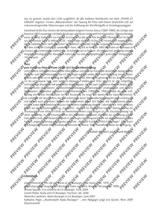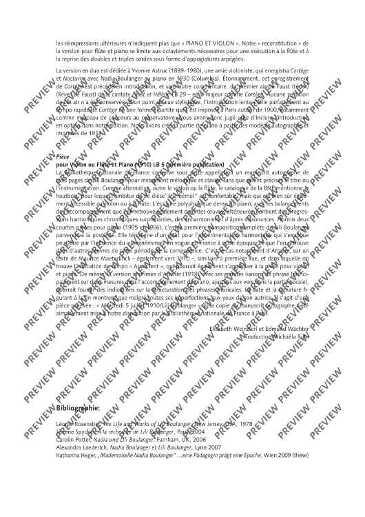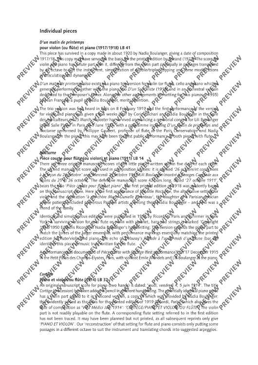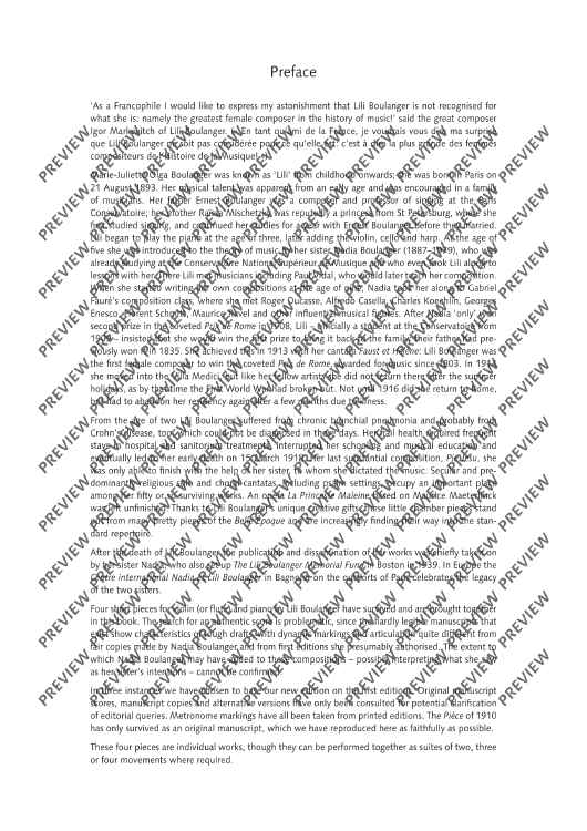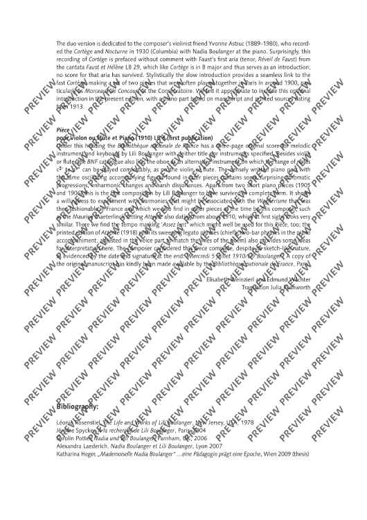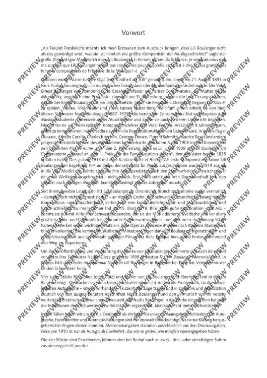 Four short pieces for violin and piano by Lili Boulanger have survived and are brought together in this book. In three instances the editors Elisabeth Weinzierl and Edmund Wächter have chosen to base our new editions on the first editions. Original manuscript scores, manuscript copies and alternative versions have only been consulted for potential clarification of editorial queries. The Pièce of 1910 has only survived as an original manuscript, which has been reproduced here as faithfully as possible. These four pieces are individual works, though they can be performed together as suites of two, three or four movements where required. 'These four enchanting violin pieces, also intended for flute, can be performed together as a suite or seperately making a charming and nostalgic addition to a recital'. (Mary Nemet, String Magazine) 'This collectiob is very well-presented, with helpful introductory and background notes which make me curious to discover more of this composer's output' (Leanie Anderson, ESTA arco magazine)