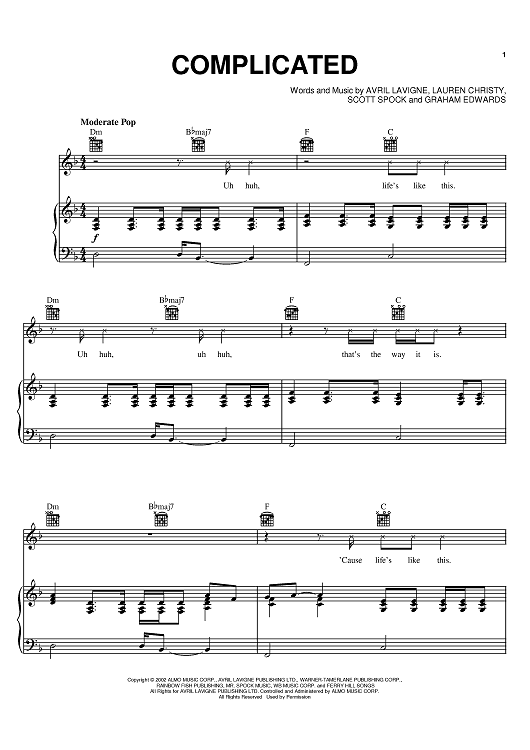 Digital Sheet Music for Complicated by Lauren Christy, Avril Lavigne, Graham Edwards scored for Piano/Vocal/Chords; id:369067