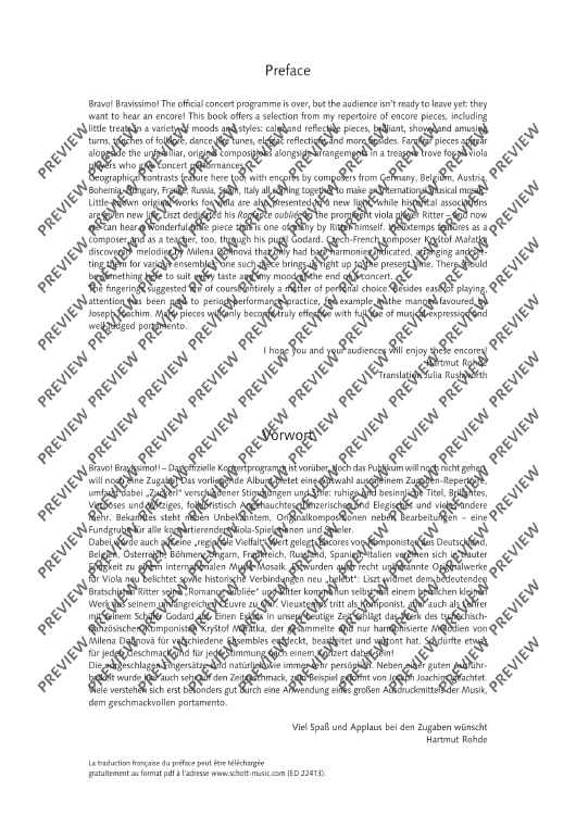 Skilfully selected encore pieces add a special touch to a concert. No matter whether virtuoso masterpieces or reflective melodies: both can help to achieve perfect harmony in the end of a successful concert. The well-known performer and viola professor Hartmut Rohde has selected encore pieces for every occasion, with works by Liszt, Vieuxtemps, Fuchs, Godard, Nedbal and many others. A treasure chest for every viola player.