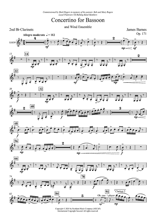 Digital Sheet Music for Concertino for Bassoon and Wind Ensemble - Bb Clarinet 2 by James Barnes scored for Concert Band; id:504650