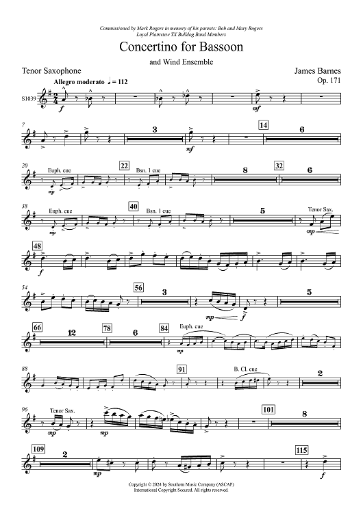 "Concertino for Bassoon and Wind Ensemble - Bb Tenor Sax" Sheet Music by James Barnes